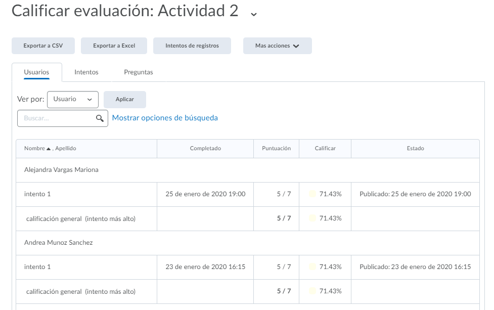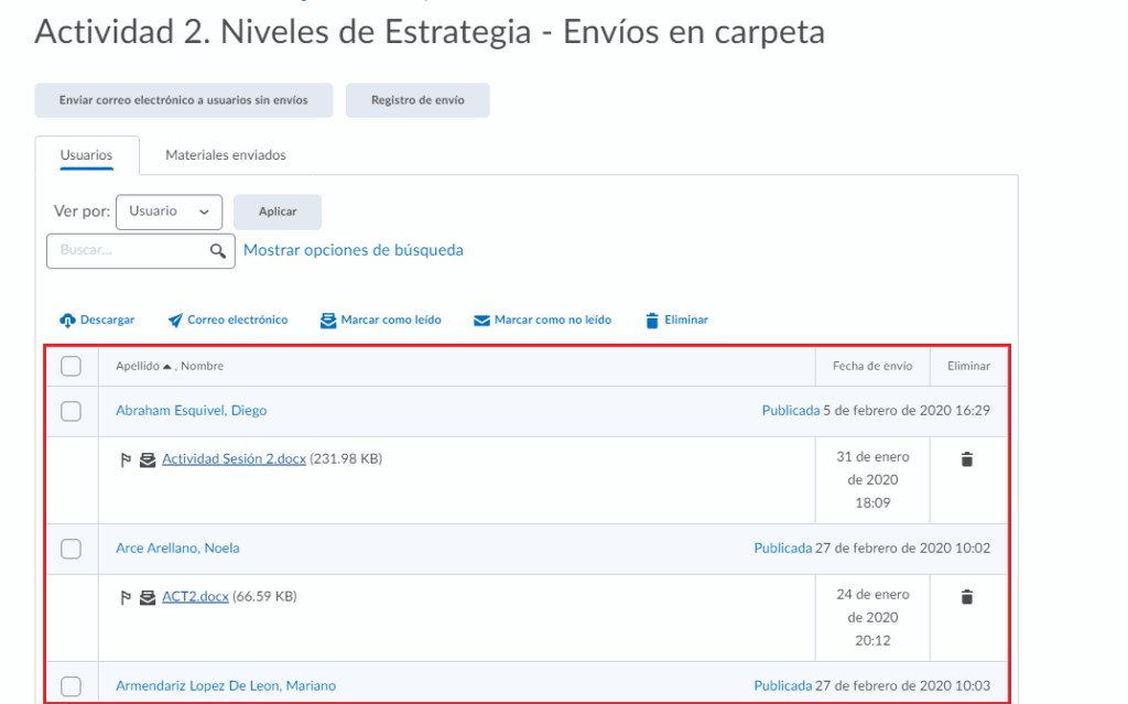 - Al darle clic al nombre de una de las actividades, nos mostrará todos los envíos de los alumnos.