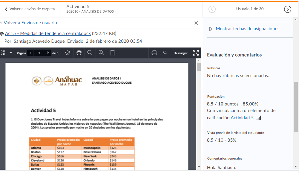 - Si le damos clic a uno de los envíos, podremos ver la tarea del alumno al igual que la calificación en caso de ya haber sido calificada.