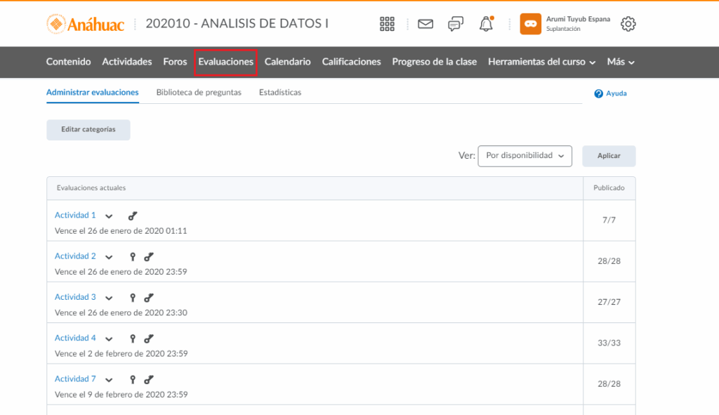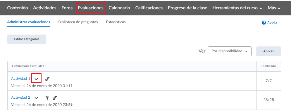 - Paso 4. En la pestaña de evaluaciones podremos ver la lista de todas las evaluaciones del curso con su respectiva información.