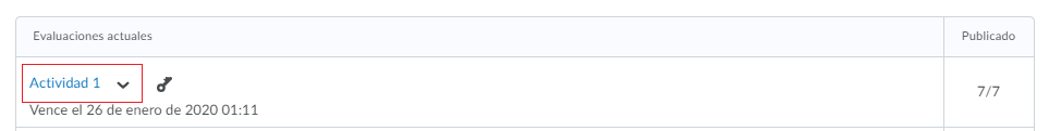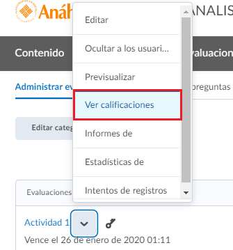 - Si se desea ver las calificaciones de una de las evaluaciones. Nos vamos a la pestaña de evaluaciones y le damos clic a la flecha que se encuentra a lado del nombre de la evaluación.