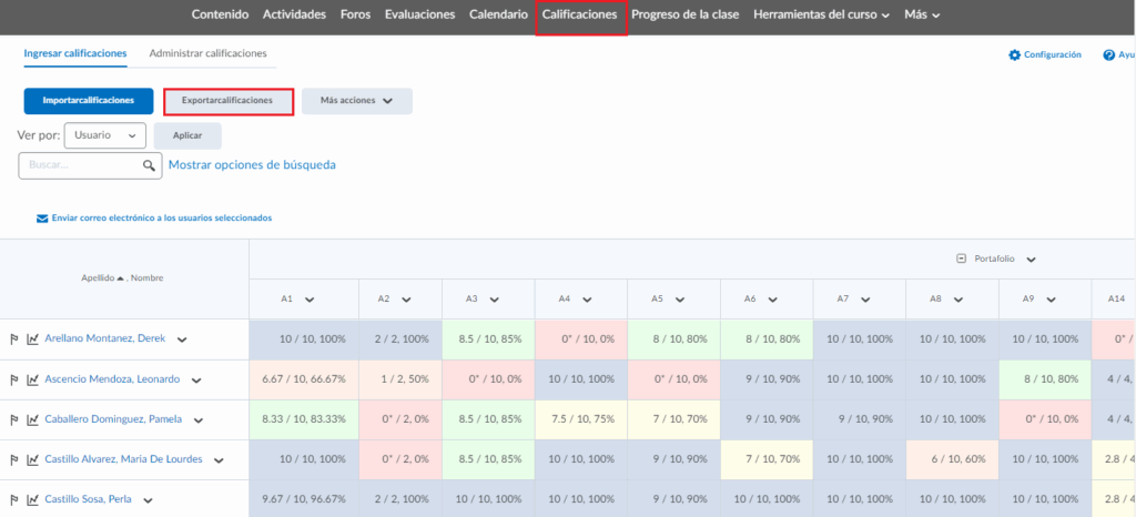 - Al igual que se pueden exportar en caso de quererlo, dando clic en exportar calificaciones.