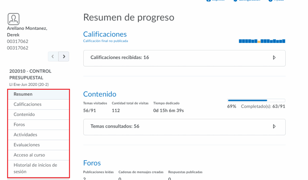 - Paso 6. De igual forma, podemos ver el progreso de la clase, le damos clic en la barra de herramientas.