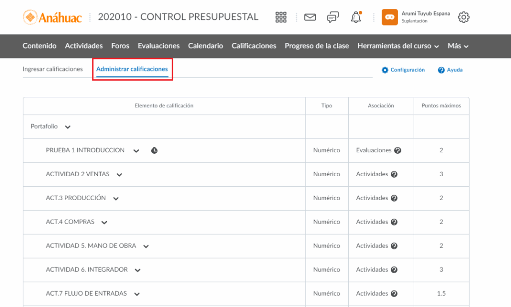 - Si le damos clic a la pestaña de administrar calificaciones, veremos los elementos de calificación que han sido creado con su actividad asociada y el valor de su puntuación máxima.