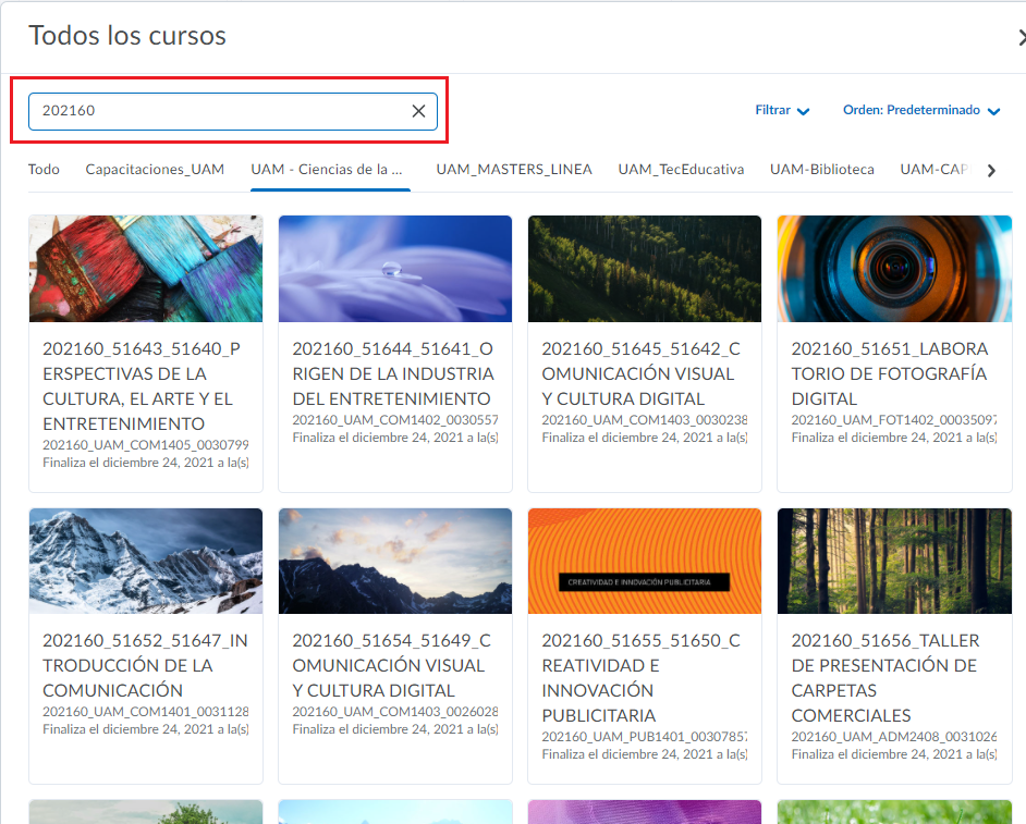 En la pestaña emergente, podemos buscar los cursos correspondientes al periodo, por ejemplo: con el número 202160