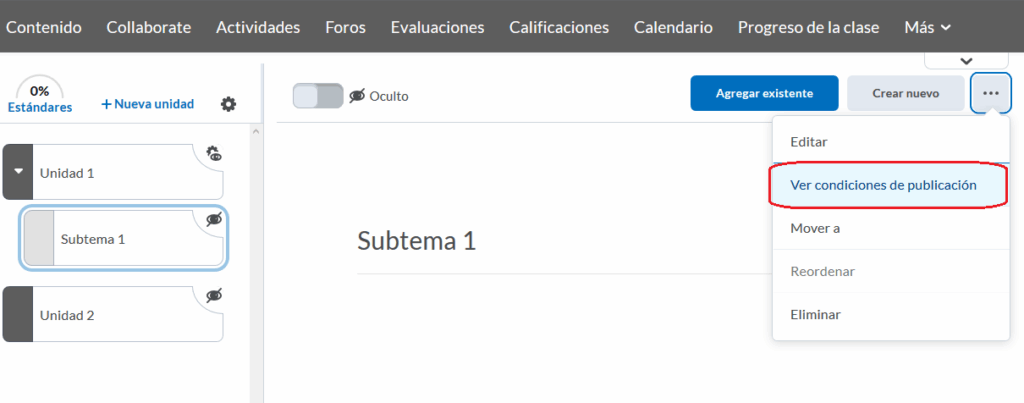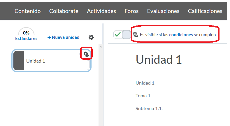 Una vez configurados, podemos identificar los contenidos que tienen restricciones para una o más secciones, por el ícono de un ojo junto a la rueda de configuración.