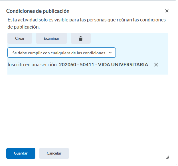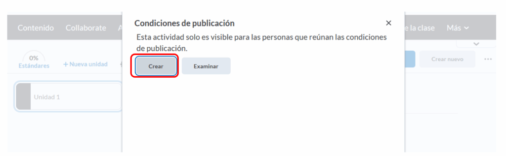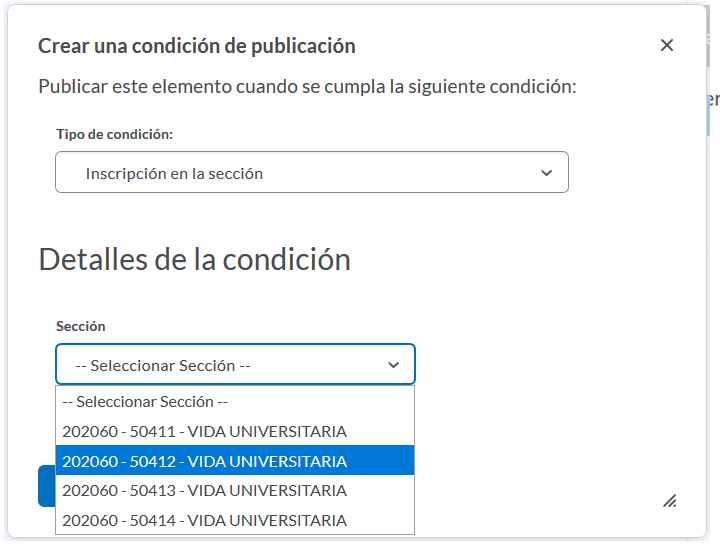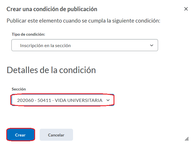 Paso 7. En Detalles de la condición, elegimos la sección para la que queremos que sea visible ese contenido en específico, y damos clic en el botón azul, de Crear