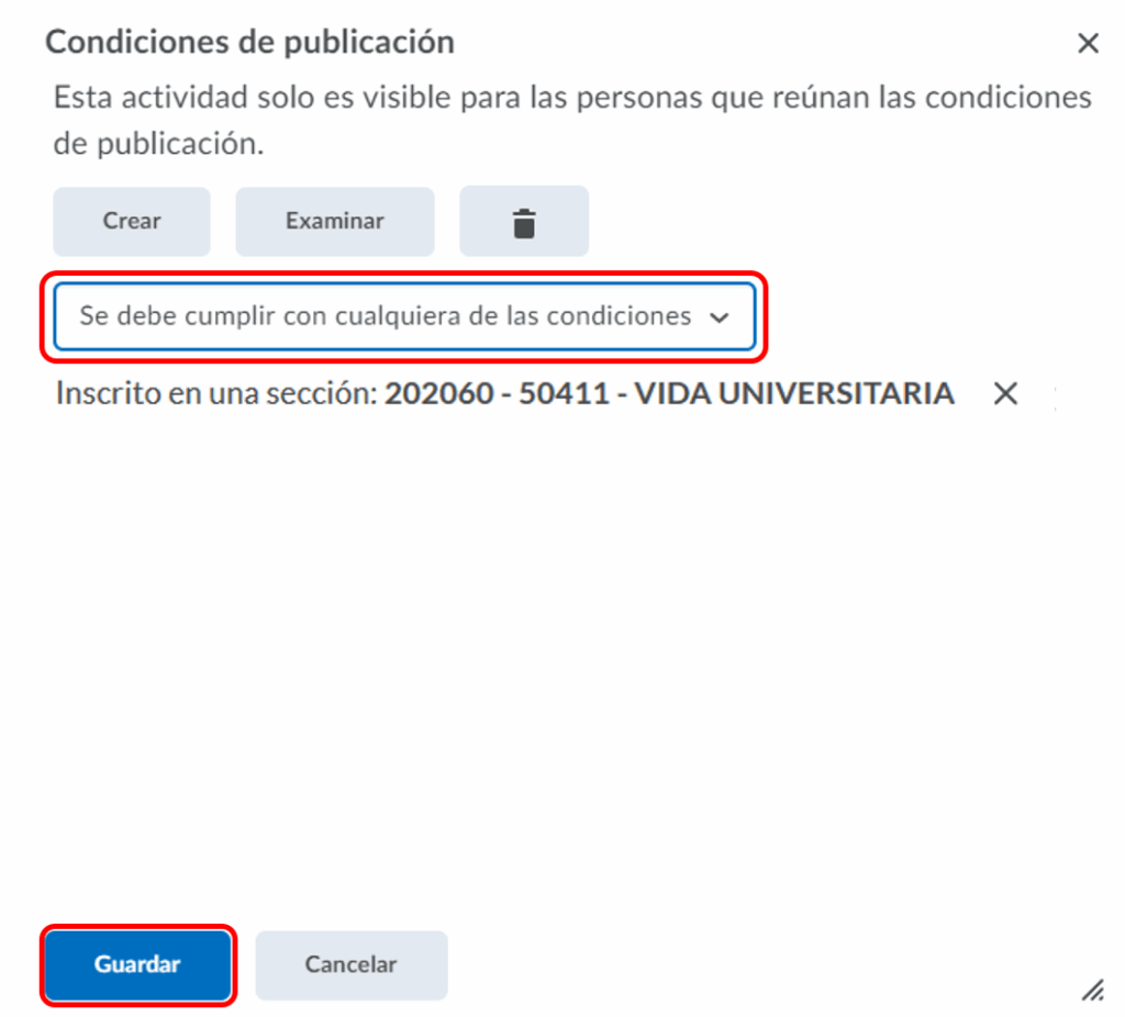 Paso 9. Después de haber seguido los pasos 7 y 8 para condicionar el contenido para una sección, en la pantalla del Paso 8 la diferencia es que elegimos la opción Se debe cumplir con cualquiera de las condiciones, y damos clic en el botón gris de Crear.