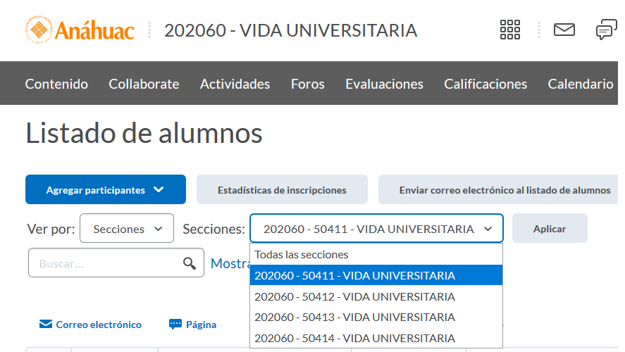 Cuando un espacio en la plataforma tiene Secciones , los alumnos sólo ven a los compañeros su propia sección (NRC); y cada elemento (contenidos, exámenes, actividades y foros) puede configurarse visible para todos los alumnos de todos, o por sección.
