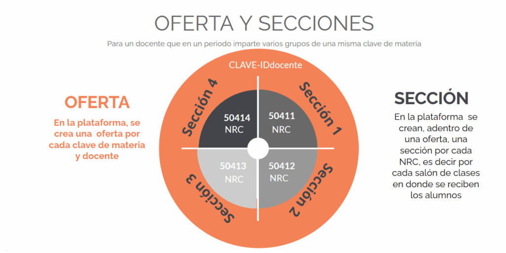 Si en este período impartes varios grupos (NRC) de una misma materia (CLAVE), la plataforma Brightspace te ayudará creando un solo espacio por cada clave de materia, llamado Oferta, y dentro de ella creará para cada NRC un grupo llamado Sección.