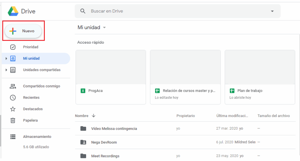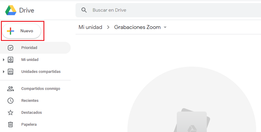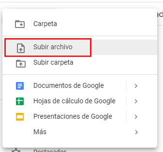 Paso 5. Para subir nuestro archivo podemos arrastrarlo al espacio o podemos dar clic en nuevo. Y elegimos la opción de subir archivo. Elegimos el archivo que queremos subir.