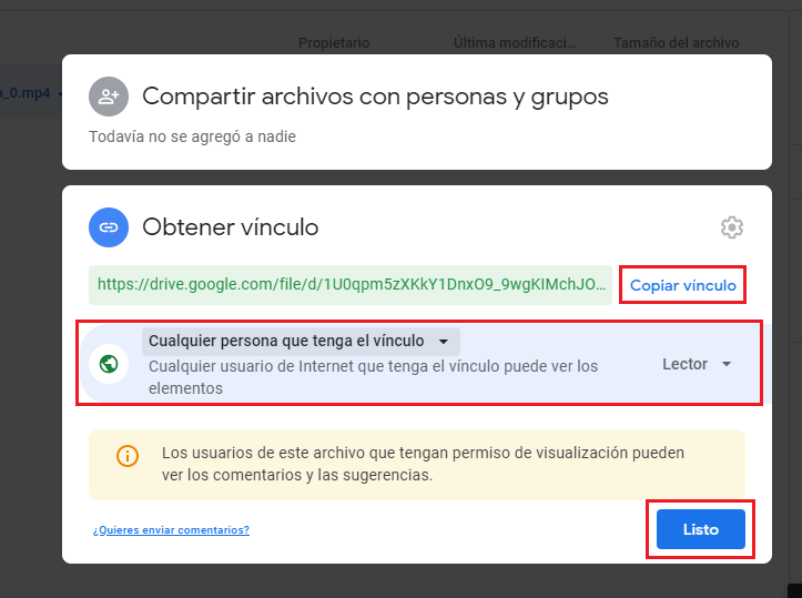 Paso 7. Lo configuramos para que cualquier persona con el enlace lo pueda ver y copiamos el vínculo. Este vínculo es el que podremos compartir a nuestros alumnos.