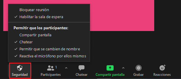 La herramienta de seguridad, nos permite configurar lo que los alumnos tienen permitido hacer, al igual que nos da la opción de habilitar la sala de espera o bloquear la reunión.