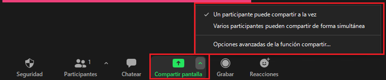 Una herramienta que nos servirá mucho, es la herramienta compartir pantalla. Si damos clic a la flecha, podremos editar la configuración de la función compartir.