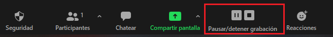 Para grabar la sesión basta con darle clic al botón de grabar. Zoom te da la opción de pausar la grabación o de detenerla.