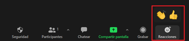 Y para finalizar, tenemos la herramienta de reacciones. Zoom nos da dos opciones de reaccionar, al darle clic al emoticón este aparecerá en nuestro recuadro.