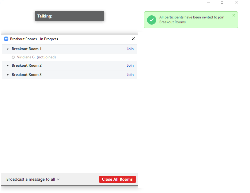 Al abrir todas las salas, podremos ver un mensaje de color verde en la esquina superior derecha, el cual nos indica que todos los participantes han sido invitados a unirse a sus respectivas salas.