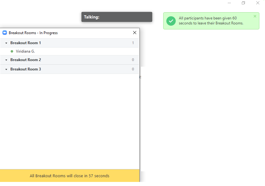 Una vez que las salas para grupos pequeños se cierran, ya sea de manera manual (si damos clic en Cerrar todas las salas) o automática (cuando el tiempo ha finalizado), aparece un mensaje de color verde en la esquina superior derecha, que indica que todos los participantes tienen la cantidad de segundos que hayamos designado, para regresar a la sala principal.