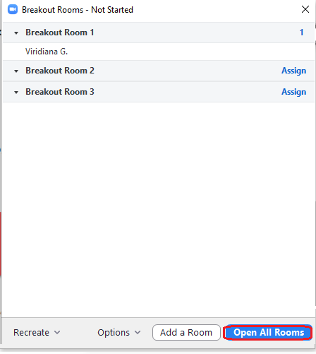 Paso 5. Una vez que seleccionamos la configuración que queremos en el recuadro anterior para cada ítem, estamos listos para poder abrir nuestras salas para grupos pequeños. Para ello, damos clic en Abrir todas las salas.