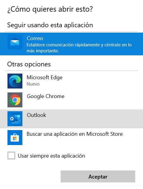 Paso 9. Se abrirá una ventana emergente, preguntándonos qué aplicación queremos utilizar. Damos clic en la opción de Correo y por último, damos clic en el botón de Aceptar.