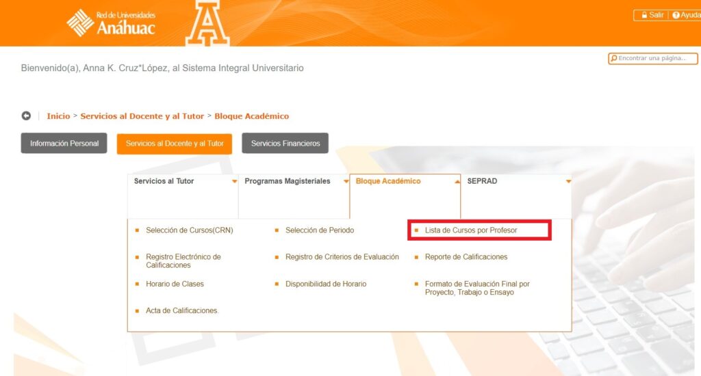 Paso 4. Seleccionamos Lista de cursos por profesor.