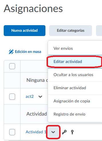 Por ejemplo, para el caso de una actividad, nos dirigiremos al vagón de Actividades y damos clic en la flecha junto a la que queremos configurar. Después, dentro del menú que se muestra, elegimos Editar actividad.