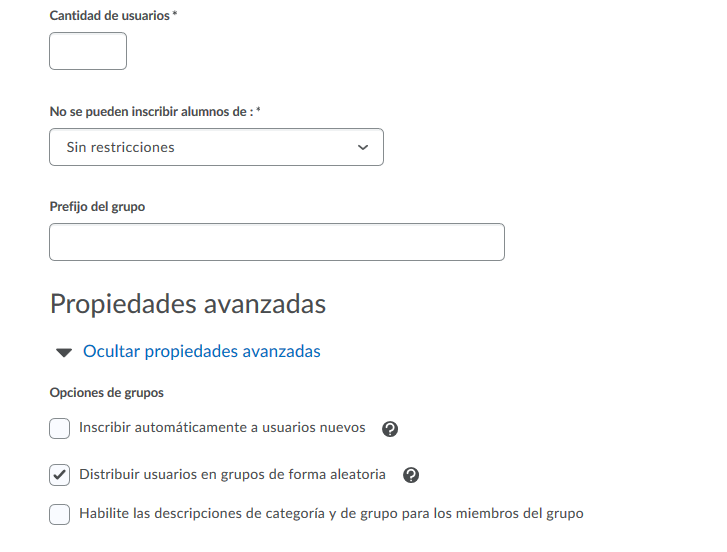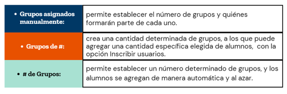 Grupos de #: crea una cantidad determinada de grupos, a los que puede agregar una cantidad específica elegida de alumnos, con la opción Inscribir usuarios.