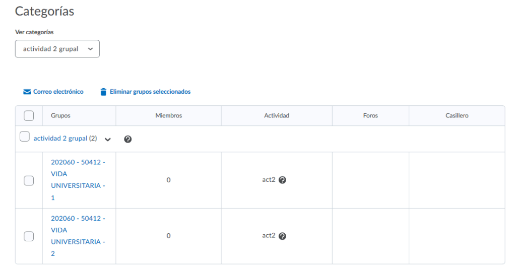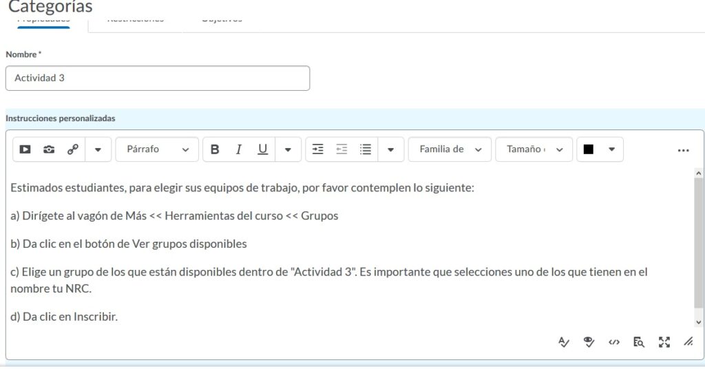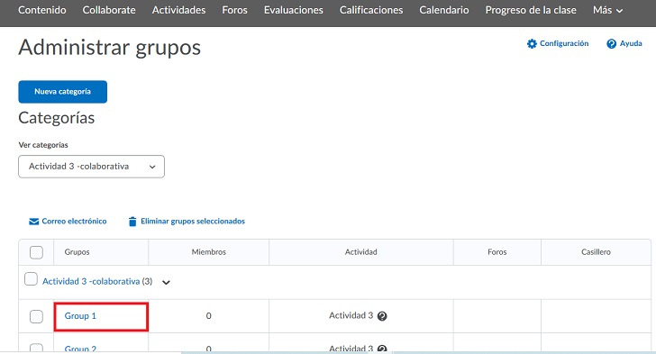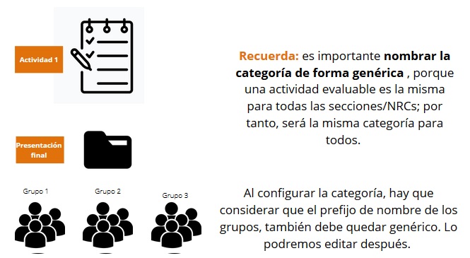 Es importante precisar que para cada actividad podemos usar sólo una categoría. Pero esa categoría sí podemos utilizarla para diferentes actividades o foros grupales.