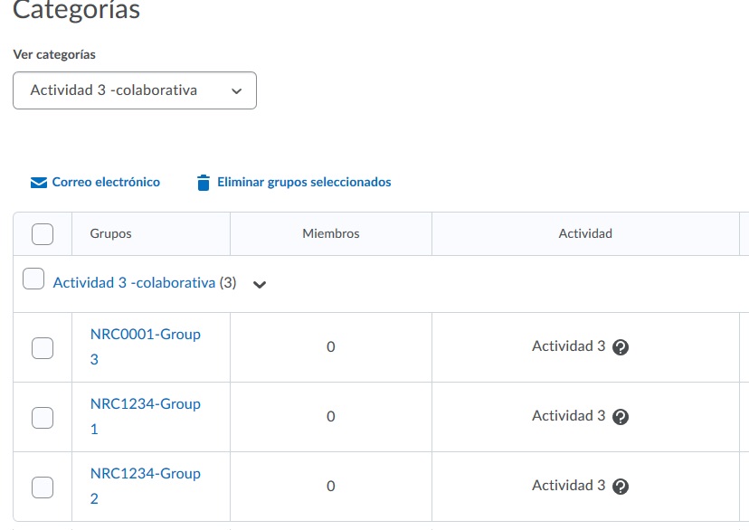 En el caso de que hayamos optado por grupos de auto-inscripción, dentro de las instrucciones de la actividad o foro grupal, podemos indicar a los estudiantes que. dependiendo de su NRC, deben elegir entre los grupos nombrados con el NRC que les corresponde.