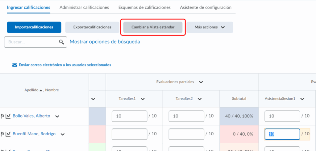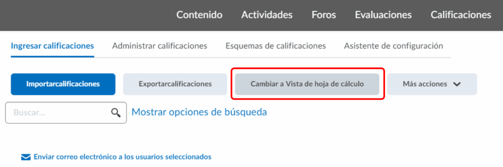 Paso 2. Para activar la vista editable del centro de calificaciones, dirígete a la parte superior y da clic en Cambiar a Vista de hoja de Cálculo.