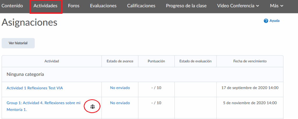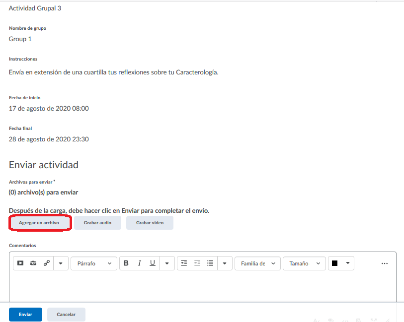 Después de dar clic en el nombre, verás la pantalla de la actividad, que es muy similar a la de una actividad individual.  Te indica el nombre de la actividad, el nombre del grupo del que formas parte, así como la fecha de inicio y cierre de la actividad.