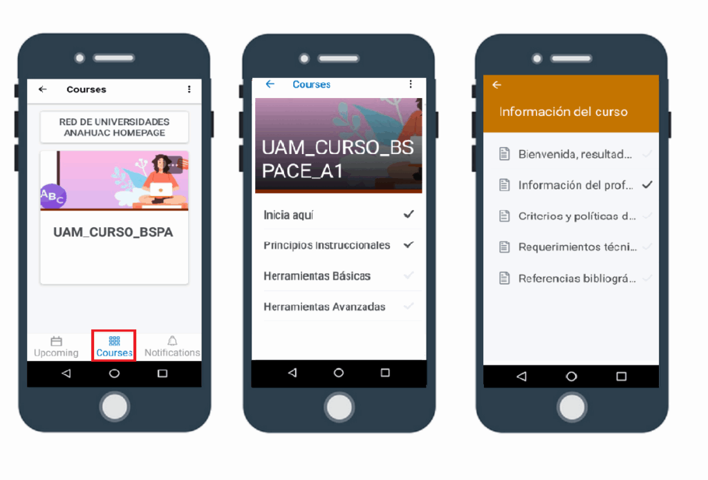 a) Courses: con lo que puede acceder a cada uno de sus cursos, revisar contenidos, y verificar su avance.