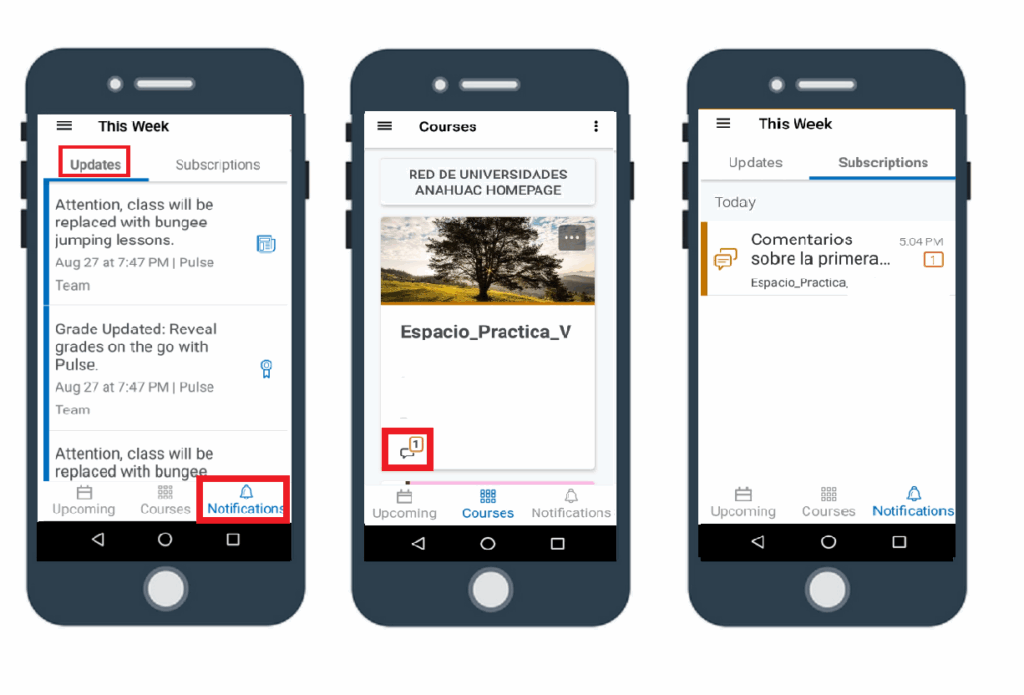 c) Notifications: En esta sección el alumno dispone de dos pestañas. En Updates, recibirá notificaciones y avisos que se hayan enviado en sus cursos. También podrá saber que tiene notificaciones porque visualizará un icono en cada curso, con el número de notificaciones que tiene pendientes de leer.