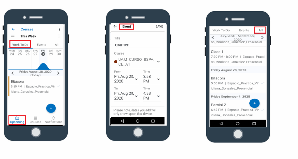 Event, muestra los detalles de cada evento específico, y le da al alumno la opción de crear eventos y recordatorios personalizados.