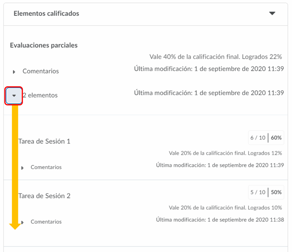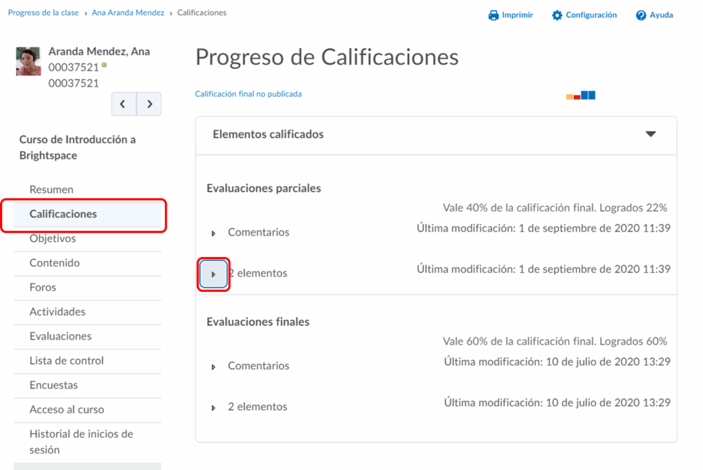 Para este ejemplo, utilizamos damos clic en Calificaciones y seguidamente en la pestaña de elementos para consultar las calificaciones del alumno. Observe que en este caso podemos observar detalles como: última modificación, valor sobre el total y el porcentaje obtenido.