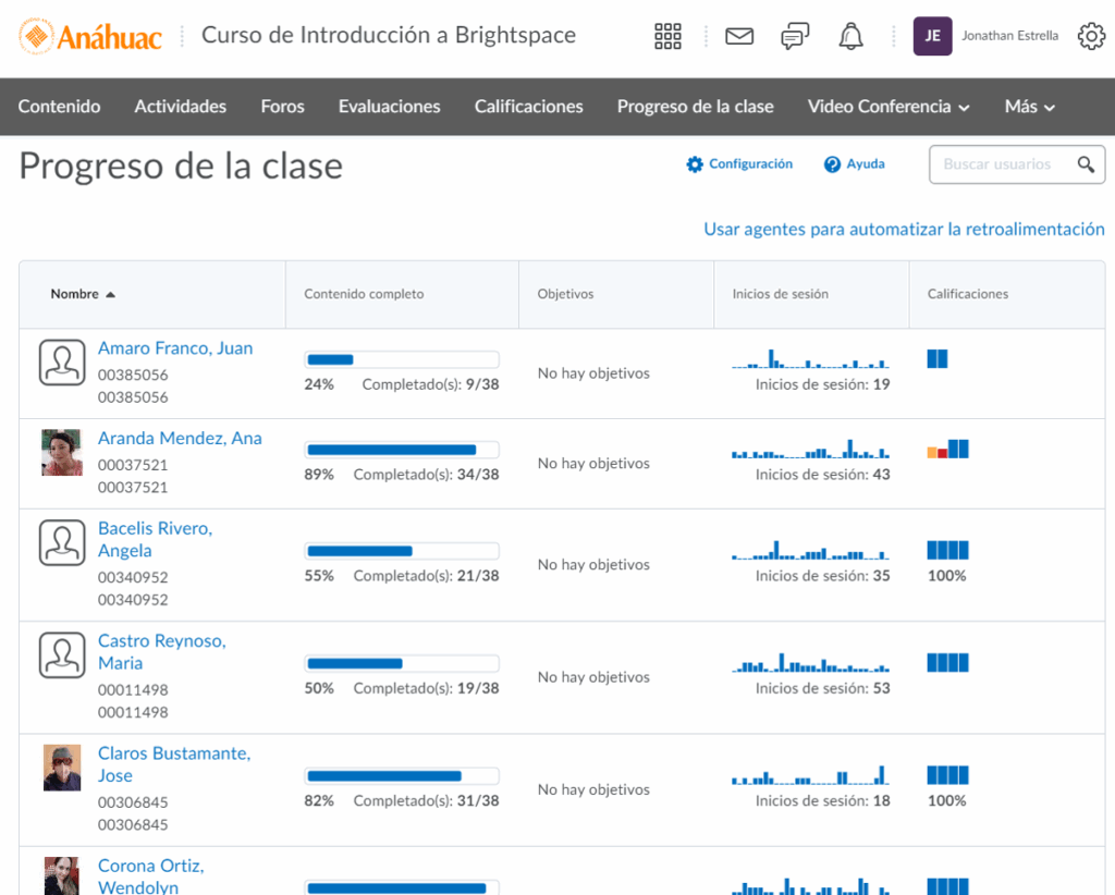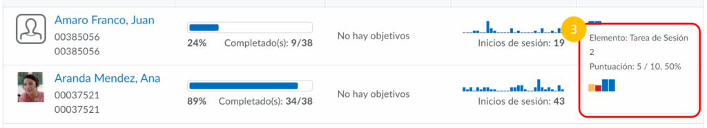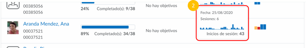 Paso 2. Una vez ingresado a la sección, se observará el listado de alumnos con una vista rápida de su progreso por alumno.
