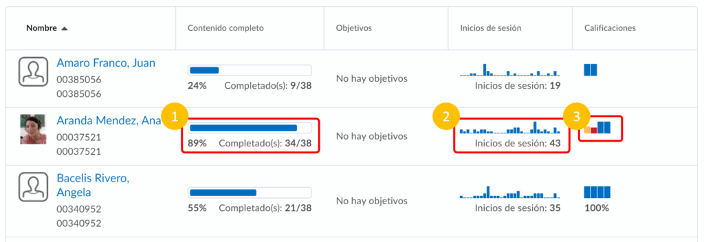 Hay 3 columnas importantes en la vista general por alumno: