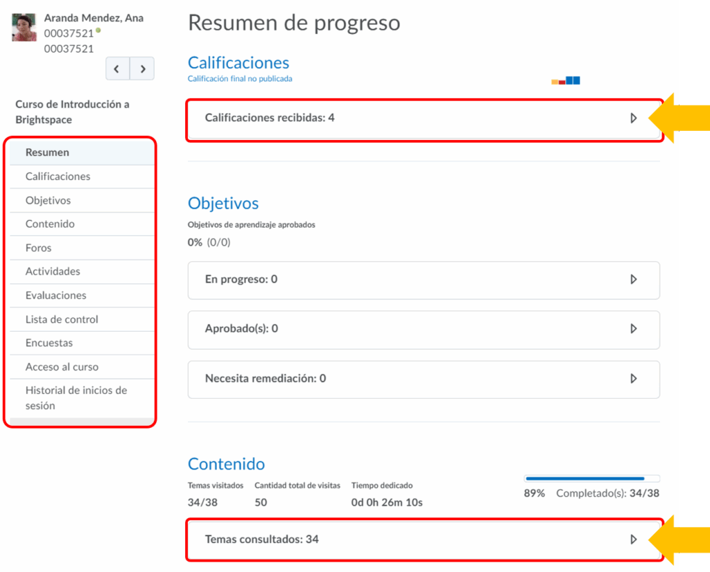 Paso 4. En pantalla se mostrará el resumen del progreso del alumno seleccionado. Veremos todas las secciones resumidas en pestañas, tales como: Calificaciones, Contenido, Foros, etc.