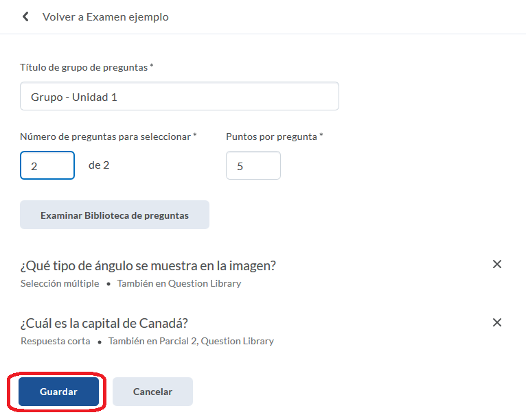 Paso 6. Veremos las preguntas que agregamos, enlistadas debajo. Ya sólo debemos indicar cuántas preguntas del total de ese grupo, queremos que se muestren al alumno, y cuántos puntos vale cada pregunta. Una vez finalizado, damos clic en Guardar.