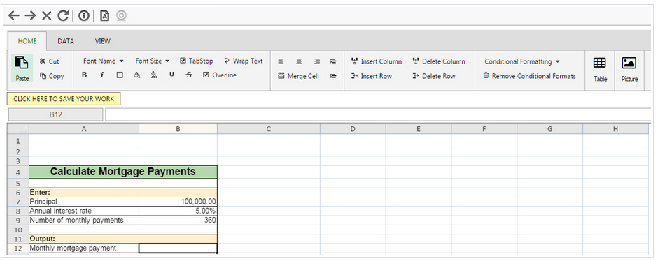 Cuando ingreses a tu evaluación con Lockdown Browser, da clic en el enlace de la pregunta que incluye una hoja de cálculo, accederás a una hoja como ésta, que cuenta con las funciones básicas, y tres pestañas.