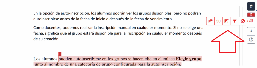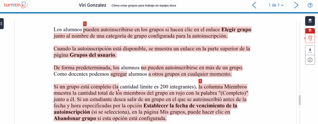 Paso 3. Visualizaremos  el archivo del alumno, con el texto coincidente de otras fuentes, marcado en color. En el caso de ser diversas fuentes, veremos diferentes colores.