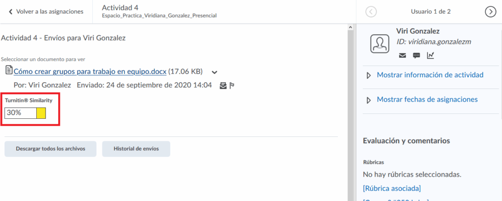 Visualizaremos la primera de las Actividades entregadas. Del lado izquierdo veremos una barra con color, que dice Turnitin Similarity.