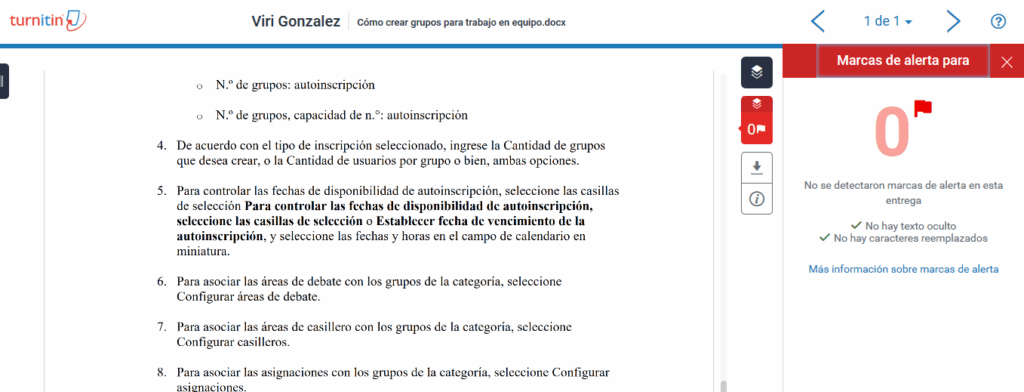 Es importante considerar que el Reporte de similitud de Turnitin no evalúa la actividad, ni garantiza de manera automática que un trabajo incluya contenido plagiado, sino que es una herramienta para que identifiquemos con facilidad coincidencias o texto similar dentro del trabajo presentado, y dependiendo de las características solicitadas, podamos determinar si esas coincidencias derivan o no, de un plagio.