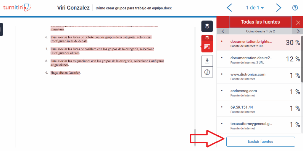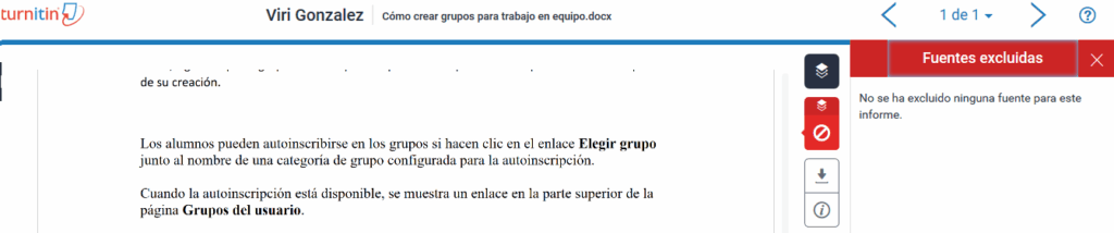 c) Todas las fuentes: nos enlista qué porcentaje proviene de cada fuente, y en la parte inferior tenemos el botón de Excluir fuentes, que podemos activar para este alumno y tarea en particular, si consideramos pertinente, en caso de que algunas correspondan a fuentes debidamente citadas y que requieren cita textual.
