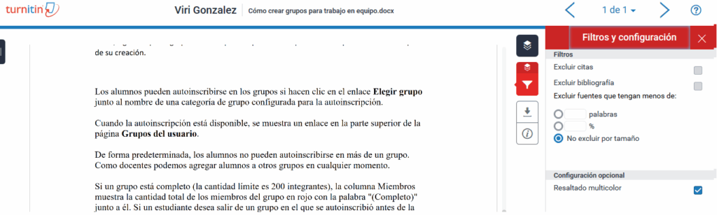 d) Filtros y configuración: es una opción más detallada para excluir fuentes, ya que podemos elegir excluir citas, bibliografía; determinar un número de palabras para identificar las fuentes a excluir, o un porcentaje.