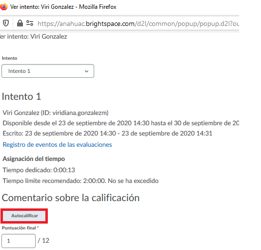 En el caso de que falte la casilla del paso 6, de “permitir que se vea el intento como calificado inmediatamente después de finalizar“, será necesario publicar manualmente las calificaciones de los alumnos, de uno en uno. Para realizar esto, debemos dar clic en el icono, y después en la ventana emergente que se muestra, seleccionar en el desplegable el Intento, y dar clic en el botón de Autocalificar.