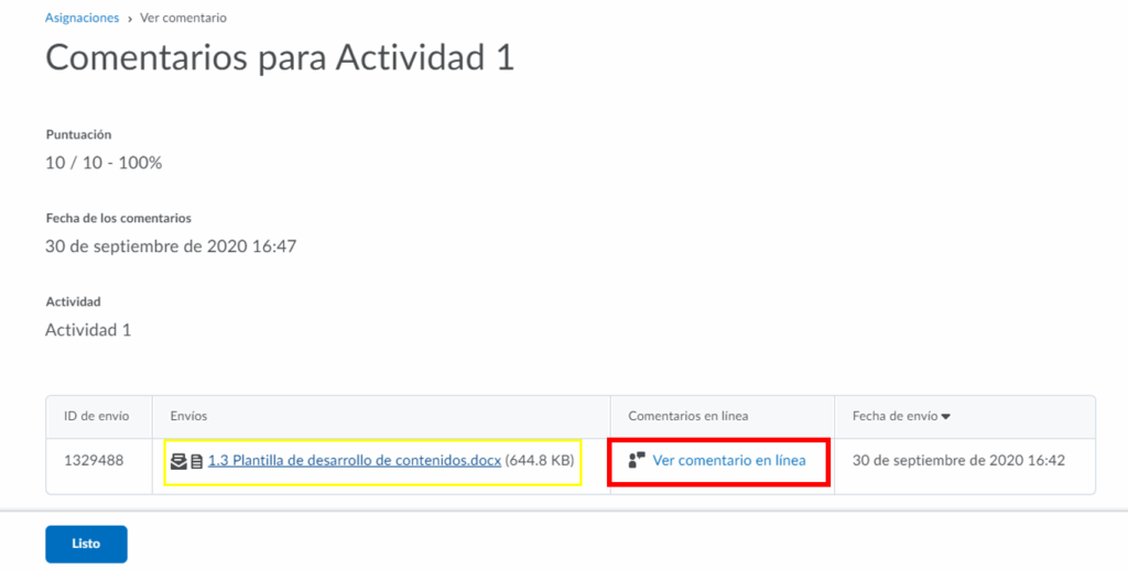 Ahora localiza la actividad que quieres consultar y encontrarás comentarios y documentos que tu docente te haya compartido, al igual que las rúbricas asociadas a ella.