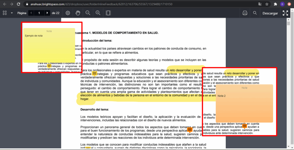 Paso 3. Al dar clic a ver comentario en línea, te abrirá una página en la cual se encontrará tu documento, pero con anotaciones hechas por tu profesor, que pueden incluir notas o señalamientos.