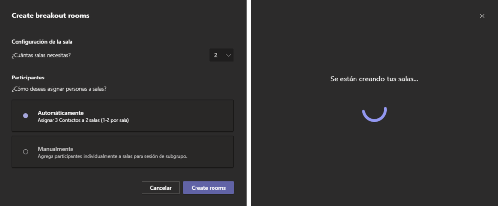 Paso 2. Se desplegará una ventana con las configuraciones de la sala: Número de salas y asignación automática o manual de equipos.