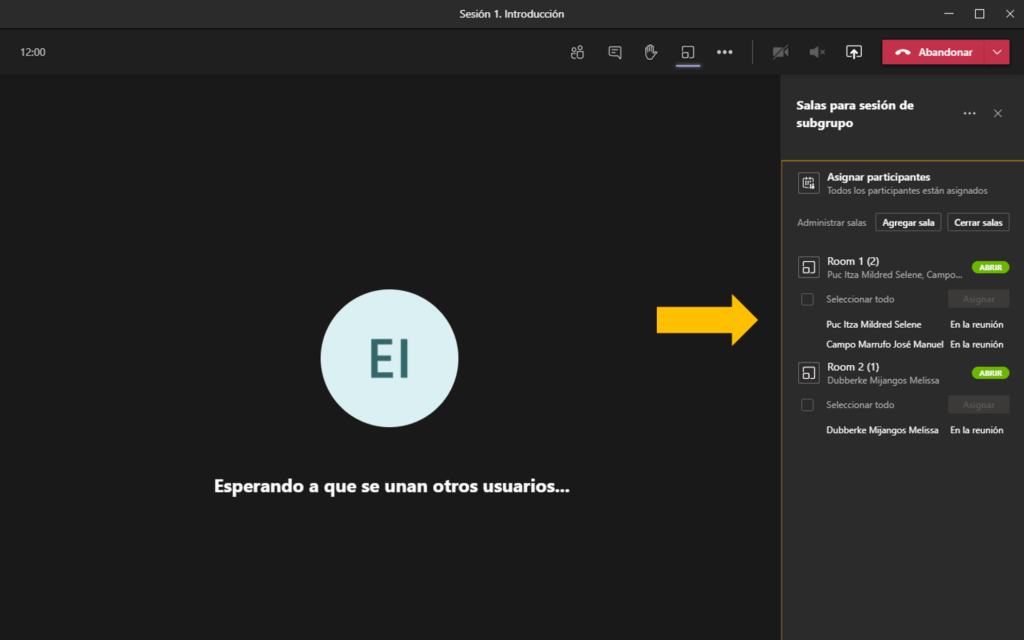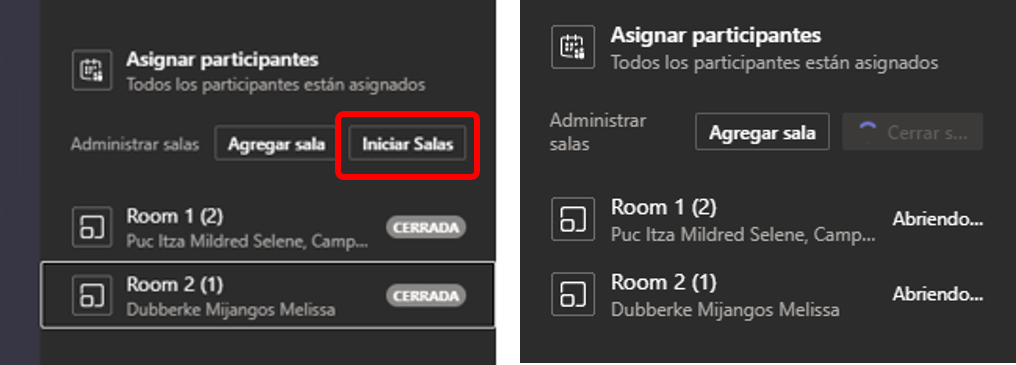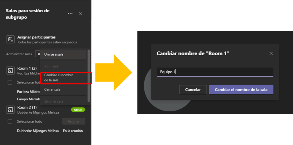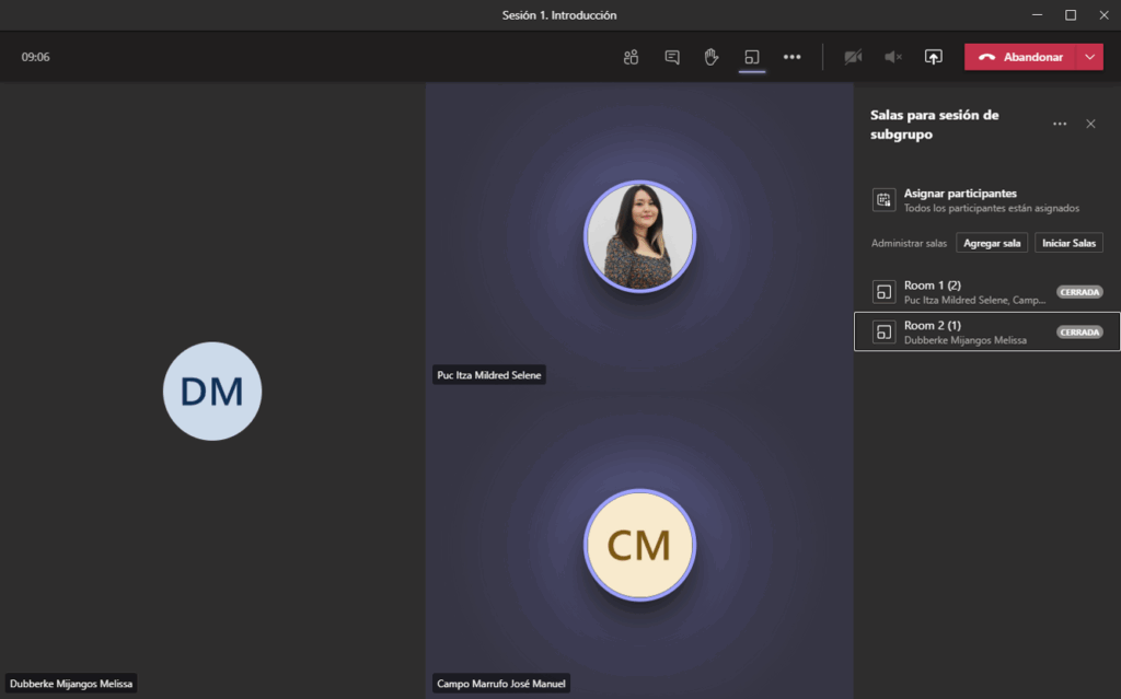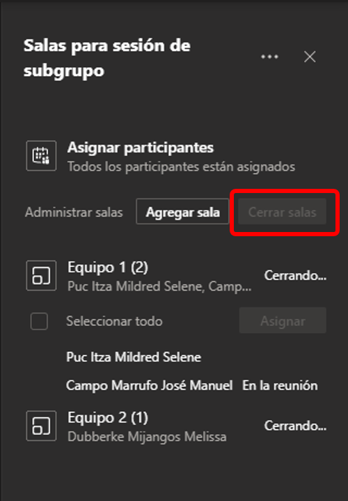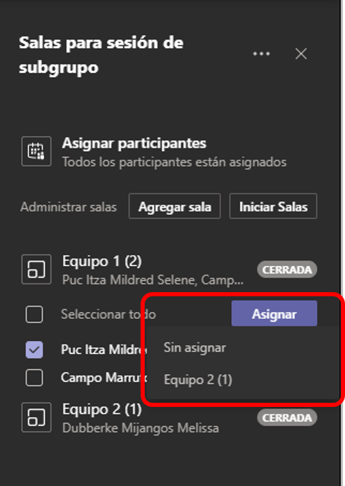 Paso 10. De ser necesario en la sala principal podemos reasignar a los participantes dando clic en Asignar y seleccionando en la lista desplegable el nombre del equipo nuevo.