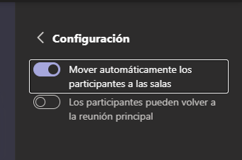 La primera opción mueve automáticamente a los participantes al iniciar la salas y la segunda permite dejar a los participantes regresar a la sala principal.